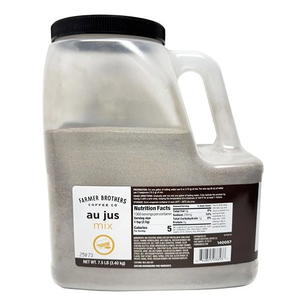 Farmer Brothers Au Jus Mix delivers a bold, savory beef flavor that enhances sandwiches, roasts, and classic French dip dishes. Designed for consistency and convenience in busy kitchens, this mix dissolves quickly in boiling water for smooth, flavorful results. Ideal for restaurants, delis, and catering operations, this bulk 7.5 lb container provides outstanding value and long-lasting supply.